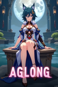 A striking movie poster featuring Yukong, a 1girl solo character with blue hair, short hair, bangs, and hair between eyes. She has blue eyes, an elegant dress with detached sleeves, bare shoulders, medium breasts, and animal ears. She is sitting in a dynamic pose, wearing high heels, with full body visible and legs elegantly positioned. The background is atmospheric, with soft lighting enhancing her presence. Below her, three-dimensional text AGlong stands out, aligned with the poster's theme. The composition is balanced, drawing attention to her gaze and the text.