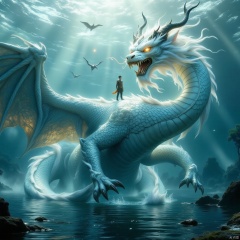 underwater,An Oriental White Dragon roams in the depths of the sea, near the Crystal Palace in the East China Sea. A person stands on the dragon's body,The dragon flies on top of it,standing alone on top of the dragon. it has cinematic light and a realistic style. The composition is very clean,Aerial view,spectacular,and has a sense of design,blue-green lake water,Chinese Martial Arts World,Chinese mythological scenes,Bright colors,Sunlight,Transparent lake water,,msj