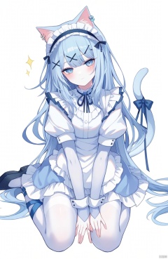 1girl, solo, long hair, looking at viewer, blush, bangs, blue eyes, simple background, hair ornament, white background, bow, ribbon, animal ears, closed mouth, blue hair, frills, hairclip, cat ears,maid headdress, sparkle, Masterpiece,Best quality,Extremely detailed,White stockings,full body,cute,Black shoes,white bodystocking
