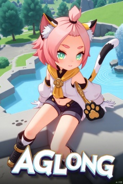 1girl, solo, sitting outdoors near a fountain, looking at viewer with a smile, one eye closed, short pink hair with bangs pinned back, green eyes, open mouth, cat ears with animal ear fluff, cat tail, navel exposed, wearing black shorts and puffy shorts, detached sleeves, white gloves, black boots, holding a bag with paw print design, thick eyebrows, cat girl theme, surrounded by a tree and paw prints on the ground, cinematic lighting, dynamic composition, movie poster style with three-dimensional text AGlong in the middle below, inspired by Diona from Genshin Impact.