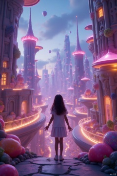 A young girl standing in the foreground, her silhouette framed against a fantastical cityscape at dusk. The city's architecture is surreal, with towering spires, glowing neon bridges, and floating platforms, all illuminated by a mix of warm and cool artificial lights. The girl is mid-pose, her arms slightly outstretched, gazing upward with a look of wonder. The scene is bathed in soft, magical lighting, with a dreamy, otherworldly atmosphere. The composition emphasizes the contrast between the girl's small figure and the vast, intricate city behind her, creating a sense of awe and mystery.