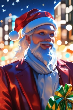 Transparent Colorful Cartoon Anime Style,(Santa Claus flying in the sky,beautiful detailed eyes,beautiful detailed lips,extremely detailed face,long white beard,wearing red suit and hat,holding a sack of gifts,smiling,over a city at night,city lights glowing,brightly lit buildings,full of Christmas decorations,snowflakes falling all around,moonlit sky,illustration,best quality,4k,8k,highres,masterpiece:1.2,ultra-detailed,realistic,photorealistic,photo-realistic:1.37,sharp focus,physically-based rendering,extreme detail description,professional,vivid colors,bokeh,Christmas atmosphere,cozy and warm,joyful,peaceful,celebratory,night scene,urban landscape,festive,sparkling lights,white snow,blurred background,soft lighting)