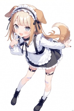 1girl, solo, long hair, looking at viewer, blush, smile, open mouth, bangs, blue eyes, skirt, blonde hair, simple background, brown hair, shirt, long sleeves, white background, bow, ribbon, animal ears, jewelry, standing, tail, full body, white shirt, :d, hairband, earrings, boots, frills, socks, fang, black footwear, apron, collar, grey eyes, maid headdress, black ribbon, thigh strap, leaning forward, piercing, white socks, ear piercing, dog ears, black nails, bandaid, dog tail, dog girl, frilled hairband, bandaid on leg, bandaid on knee
