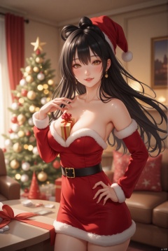 A radiant Asian woman with long, flowing jet-black hair stands poised in a luxurious living room, her eyes sparkling with holiday cheer. She's dressed in a red Santa costume that accentuates her curves, complete with a white fur trim and a belt that cinches at her waist. Her pose is playful and seductive, one hand on her hip, the other gently holding a gift box that rests between her breasts. The gift box, wrapped in gold paper with a red ribbon, is nestled perfectly in her cleavage, drawing the eye to the alluring display. The soft lighting highlights her warm skin tone, and her smile is as bright as the twinkling lights on the nearby Christmas tree.