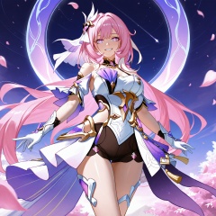 realistic,2.5D,photorealistic,1girl absurdres black_shorts boots diamond-shaped_pupils diamond_(shape) dress elysia_(herrscher_of_human:_ego)_(honkai_impact) elysia_(honkai_impact) falling_petals full_body gloves gradient_eyes grin hair_ornament highres honkai_(series) honkai_impact_3rd long_hair looking_at_viewer multicolored_eyes petals pink_eyes pink_hair shorts smile solo standing symbol-shaped_pupils teeth violet_eyes white_dress white_footwear white_gloves xuan_xuan_xuan_za,