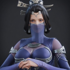 1girl,solo,<lora:ponyyoujiV1:0.8>,veil,mouth_veil,black_hair,hair_ornament,score_9,breasts,medium_breasts,dress,jewelry,covered_mouth,brown_hair,black_eyes,blue_eyes,armor,earrings,long_hair,blue_dress,bridal_gauntlets,detached_sleeves,single_hair_bun,hair_stick,headdress,long_sleeves,purple_eyes,hair_bun,realistic,black_nails,cleavage,long_dress,makeup,BREAK score_9,upper_body,portrait,shiny_skin,looking at viewer,cinematic lighting,volumetric lighting,solo focus,(huge breasts:0.9),(simple background,pure black background,black background:1.1),