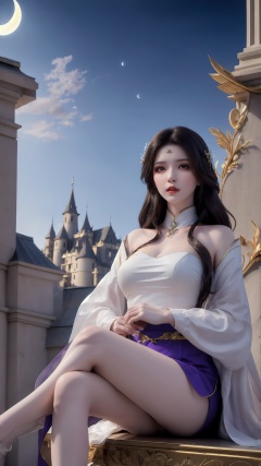 The image is a digital illustration of a young woman sitting on a throne. She is wearing a white and purple outfit with gold accents. The outfit has a high neckline and long sleeves. She has long dark hair that is styled in loose waves and falls over her shoulders. The woman is sitting with her legs crossed and her hands resting on her lap. The background is a dark blue sky with a crescent moon and a castle in the distance. The overall mood of the image is mystical and regal..,<lora:1.5玄衣lora-000001.by_tusi:0.8>,