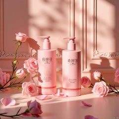 Romantic lighting at night, product photography, 2 bottles of pink shampoo on the table, surrounded by pink roses and soft lights as background, dotted with delicate pink rose flowers, illuminated by natural sunlight. The brand name is "Im Automation", the soft light exudes an elegant atmosphere, and the background wall has intricate carving patterns and light pink decorationst.