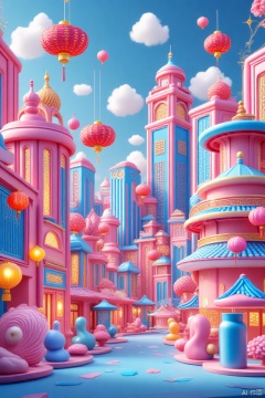 Pink and blue,sweet,town,sunny,clear,high brightness,aerial shooting,blue sky and white clouds,cute,candyspring festival, city,spring festival,chinese dragon,春节,solo