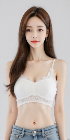 A 3D rendering of a woman with long brown hair. She is wearing a white bra and blue jeans. The woman's hair is long and cascades over her shoulders. Her eyes are blue and her lips are red. Her hair is pulled back in a ponytail. She has a slight smile on her face. The background is a light gray color.