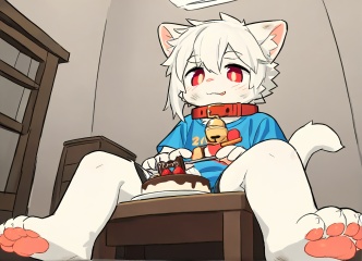 furry,boy,shota,T-shirt,shots,cat ear,cake,candies,food,foot foucs,shota,body fur,from_below,white hair,thick eyebrows,Right mid length drooping frontal hair,(Asymmetric hair on the temples:1.2),[bell on collar,Collar,Cortical collar,Large collar],highres,game cg,bedroom,bare furry,dirty,dirty feet,white fur,<lora:furry工坊:0.5>,