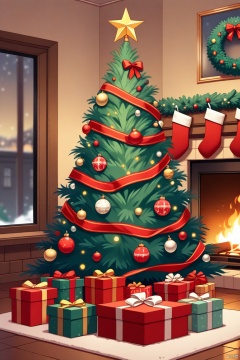 A house with Christmas decorations, including a Christmas tree, ornaments, gift boxes, armchairs, and a close-up of the fireplace