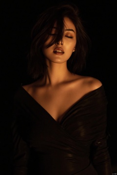 A cinematic masterpiece unfolds on a luxurious, velvety black background. A stunning female figure, radiating inner beauty, stands center frame, her porcelain skin glowing under warm golden lighting. Her raven tresses cascade down her back like night's dark mystery, framing her flawless features. Eyes closed, she seems lost in the moment, her full lips subtly curved into a serene smile.reinforcing the film's high production value.,plns,cher