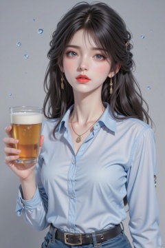 An animated image of a woman holding a glass of beer. The woman is wearing a light blue shirt with a blue collar. She is also wearing a gold necklace and earrings. Her hair is black and wavy. Her eyes are blue and her lips are red. She has a black belt around her waist. The belt has a silver buckle on it. There are bubbles floating in the air around her head.