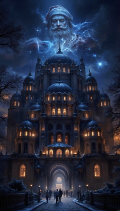 With the arrival of night, the sky became deep sapphire, and the outline of Hagia Sophia became more and more clear in the night. Suddenly, a strange light flashed over the church, and then, a huge virtual shadow of Santa Claus slowly emerged, suspended above the dome of the church. The virtual shadow of Santa Claus is unusual. It emits a faint blue light, as if it were made up of countless flashing ice crystals, giving people a warm and mysterious feeling. The texture of his beard and clothes is looming in the light and shadow, as if carved by snow. His eyes are shining kindly, as if guarding the city and bringing people festive blessings and warmth. Around the virtual shadow, snowflakes seem to be attracted by some mysterious force and begin to rotate and dance around Santa Claus, forming a huge snowflake vortex. Against the background of virtual shadows, these snowflakes seem to be endowed with life. They shine with colorful light and complement Santa Claus' blue light, forming a fantastic and beautiful picture. Around the church, people stopped in a hurry and looked up at this incredible sight. The children's eyes were full of surprise and joy. They cheered and jumped as if they saw the real Santa Claus. Adults were also attracted by this fantastic scene, and their faces showed a long-lost smile, as if they had returned to their childhood and relived that innocence and happiness.,European architecture