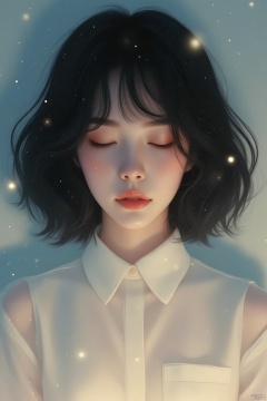 menglong,1girl, solo, short hair, bangs, shirt, black hair, closed mouth, closed eyes, white shirt, upper body, lips, light particles, nose