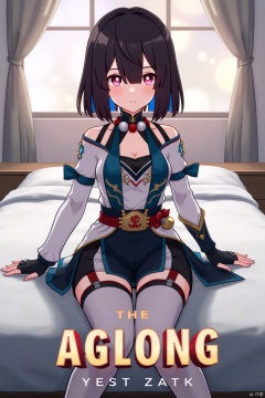 1girl, solo, xueyi, breasts, looking at viewer, blush, short hair, bangs, black hair, red eyes, thighhighs, gloves, dress, bare shoulders, sitting, closed mouth, blue hair, pantyhose, multicolored hair, black gloves, indoors, fingerless gloves, two-tone hair, white thighhighs, bed, feet out of frame, bed sheet, on bed, tassel, knees together feet apart, colored inner hair. Mid-shot framing with soft lighting, composition centered on the girl, artistic pose on a bed with a sheet. Movie poster style, three-dimensional text AGlong with poster theme in the middle below, cinematic and vibrant atmosphere.