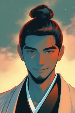 solo, black hair, 1boy, smile, upper body, male focus, japanese clothes, hair bun, face to viewer, colored skin, single hair bun, haori