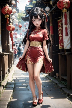 <lora:ChineseNewYear:0.8>, chinese new year, girl, (smirk:-0.4), long hair, arms at sides, red chinese clothes, paper lantern, full body, leather shoes, (chibi:0.2),