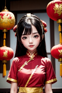 <lora:ChineseNewYear:0.8>, chinese new year, girl, (smirk:-0.4), long hair, arms at sides, red chinese clothes, paper lantern, upper body,