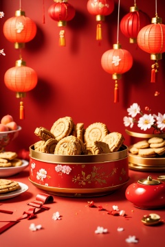 <lora:ChineseNewYear:0.8>, chinese new year, chinesenewyearstyle, no humans, hand fan, folding fan, peach blossom, red theme, red ribbon, flower, blurry, paper lantern, ribbon, lantern, red background, food, biscuit, still life, floral print, petals, depth of field, branch