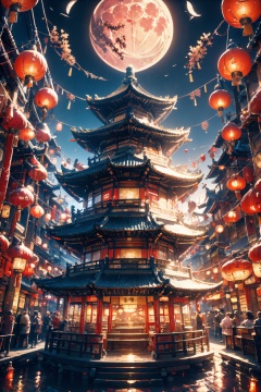 <lora:ChineseNewYear:0.8>, chinese new year, chinesenewyearstyle, architecture, east asian architecture, scenery, no humans, night, lantern, moon, building, full moon, sky, paper lantern, outdoors, pagoda, tower, night sky, city, cityscape, cloud