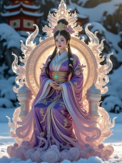 At the top of Kunlun Mountain, shrouded in clouds and mist, the Queen Mother of the West sits solemnly on a magnificent throne. She is tall in stature, with a beauty that blends softness and transcendence. Her deep eyes reveal wisdom and majesty. Long hair like silk, tied into a bun, adorned with gold and jade, shining brightly in the sunlight. She was wearing a deep purple robe with exquisite gold patterns, and a gemstone waistband accentuated her waist. The palace behind us is a combination of ancient simplicity and magnificence. The glazed tiles are shining, the cornices of arch of wooden architecture are carved with divine animals, the jade steps are warm, and the stone columns on both sides are carved with ancient legends and patterns.,Lying Like a Bow - Ice Sculpture