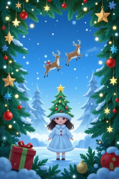 Christmas Frame Scene, Q-version wool felt, 3D, Christmas tree-shaped makeup, playful and cute little girl, cute white dress, standing, with a Christmas tree-shaped hat on her head, covering only two eyes, hollowed out like a ghost, Christmas atmosphere, surrounding There is a surprise box, there are many stars in the sky, the reindeer pulls the sledge and flies across the sky, shallow depth of field, hazy light, mysterious dream, low saturation, cinematic feel, cool blue color