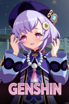 1girl, solo, looking at viewer, blush, open mouth, :o expression, purple hair with bangs, hair between eyes, braid, sidelocks, purple eyes, hair ornament with coin, qing guanmao hat, long sleeves with wide sleeves, dress, jewelry, earrings, necklace with beads, nail polish, black nails, Chinese clothes, claw pose, ofuda, jiangshi-inspired, vision (Genshin Impact), bead necklace, dramatic lighting, centered composition, three-dimensional text AGlong in the middle below, movie poster style, qiqi (Genshin Impact) theme.