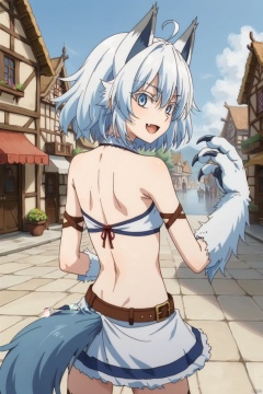 1girl  ,solo , looking at viewer  ,smile  ,short hair , open mouth  ,blue eyes , skirt , navel , animal ears,  blue hair  ,tail ,ahoge  ,white hair ,fang  ,midriff  belt  ,wolf ears , monster girl,  claws  ,wolf tail , armlet , animal hands  fur,slim,skinny,village,(slim:1.5),(skinny:1.2) ,((((back:1.4))))