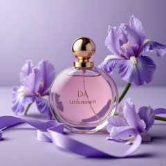 The iris flowers in the background are blurred, highlighting the dominant position of the perfume bottle. The whole picture has soft tones, giving people a noble and romantic feeling. This arrangement is not only beautiful and elegant, but also reminds people of the pleasure and enjoyment brought by perfume.