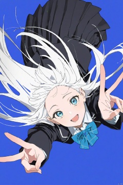 1girl, solo, v, long hair, skirt, double v, bow, open mouth, smile, blue background, school uniform, blue bow, jacket, black skirt, pleated skirt, black jacket, bowtie, white hair, shirt, blue bowtie, looking at viewer, floating hair, long sleeves, bangs