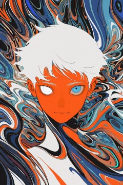 looking at viewer, solo, blue eyes, abstract, 1boy, 1other, male focus, white hair, short hair, closed mouth, colored skin, white eyes, upper body, surreal