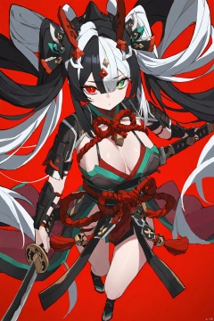 1girl, heterochromia, solo, red eyes, black hair, long hair, multicolored hair, hair ornament, red background, white hair, twintails, hair between eyes, weapon, looking at viewer, rope, green eyes, sword, bangs