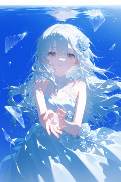 konya666,1girl,solo,long hair,dress,looking at viewer,white eyes,glass,white dress,grey eyes,white hair,flower,broken glass,white theme,dress flower,blue theme,bare shoulders,glass shards,white flower,reaching,reaching towards viewer,water,parted lips,closed mouth,sleeveless,reflection,sleeveless dress,white rose,watermark,expressionless,