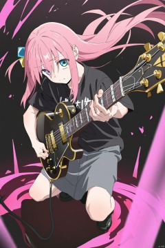 gotou hitori, 1girl, cube hair ornament, solo, long hair, pink hair, instrument, blue eyes, holding instrument, hair ornament, holding, one knee, playing instrument, black shirt, guitar, shirt, gibson les paul, floating hair, bangs, music, short sleeves, electric guitar, hair between eyes, closed mouth, looking at viewer, black footwear, very long hair