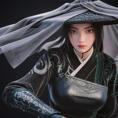 <lora:YQponyningyao_heiyiV4:0.8>,solo,1girl,black_hair,long_hair,armor,realistic,ponytail,chinese_clothes,long_sleeves,black_eyes,brown_eyes,arm_guards,hat,1boy,high_ponytail,veil,brown_hair,boots,jewelry,short_hair,hair_bun,breastplate,black_headwear,kimono,black_footwear,hanfu,layered_sleeves,pants,vambraces,BREAK score_9,upper_body,portrait,shiny_skin,looking at viewer,cinematic lighting,volumetric lighting,solo focus,(huge breasts:0.9),(simple background,pure black background,black background:1.1),