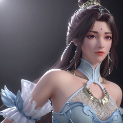 <lora:YQponyyuecan_lanyiV4:0.8>,q1528437228,solo,1girl,long_hair,black_hair,hair_ornament,dress,jewelry,bare_shoulders,white_dress,earrings,hair_bun,forehead_mark,facial_mark,brown_hair,single_hair_bun,purple_eyes,blue_eyes,detached_sleeves,realistic,gloves,blue_dress,see-through,beads,white_footwear,forehead_jewel,necklace,tiara,bracelet,detached_collar,fingerless_gloves,legs,BREAK score_9,upper_body,portrait,shiny_skin,looking at viewer,cinematic lighting,volumetric lighting,solo focus,(huge breasts:0.9),(simple background,pure black background,black background:1.1),