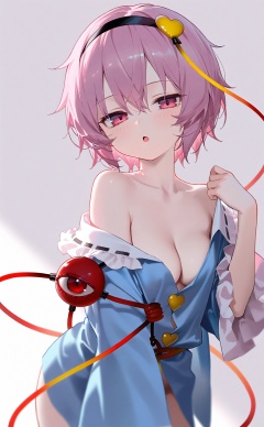 masterpiece,loli,1girl,komeiji satori,solo,breasts,third eye,heart,shirt,hairband,wide sleeves,pink hair,simple background,blue shirt,pink eyes,long sleeves,white background,collarbone,looking at viewer,short hair,black hairband,frills,blush,off shoulder,medium breasts,cowboy shot,frilled sleeves,hair ornament,heart hair ornament,frilled shirt collar,eyeball,open mouth,cleavage,bare shoulders,naked shirt,:o,hand up,no bra,hair between eyes,fair_skin,pale_skin,white_background,rim light,Cinematic Lighting,blurry,
