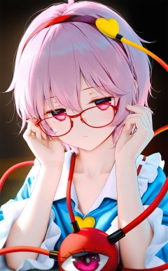 masterpiece,blurry background,loli,loli,black_background,light leaks,fair_skin,Artist haneru,Artist:hiten_(hitenkei),artist chen_bin,artist:wanke,(artist:ke-ta:0.6),[Artist:wlop],(Artist agwing86:1.3),(Artist aki99:0.5),(Artist z282g:0.66),1girl,solo,pink hair,komeiji satori,red-framed eyewear,glasses,pink eyes,short hair,long sleeves,hairband,closed mouth,upper body,bespectacled,looking at viewer,heart,red hairband,shirt,frills,frilled sleeves,hair between eyes,hands up,heart hair ornament,collarbone,expressionless,blue shirt,