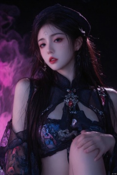 A striking image of a solo female figure with long black hair and a hat, gazing directly at the viewer. Her piercing blue eyes seem to gleam in the dimly lit atmosphere. The exposed shoulders reveal intricate jewelry adorning her upper body. Detached sleeves frame her pointy ears, which sport a fang-like protrusion. Her lips are painted a deep red, complementing her fingernails. A clothing cutout accentuates her curves, while Chinese-inspired attire wraps around her slender figure. A striking facial mark and piercing ear studs add to the overall mystique. In her hand, she grasps an ofuda, evoking the supernatural essence of a jiangshi. The qing guanmao's eerie glow casts an otherworldly ambiance, drawing us in with its haunting beauty.ofuda,A FOG CREATURE