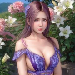 <lora:847-DA-XL-死或生-Elise-BirthdaySuit-20220903:0.8>, (,1girl, ,best quality, ),,  ,ultra detailed 8k cg,ultra realistic 8k cg,1girl, solo,(bare shoulders:0.85),(masterpiece, best quality),((oil painting style)),sexy young lady,(beautiful face and eyes),(upper body:1.5),(whole body:1.05),(single person:1.2),surrounded by flowers, (lily), roses, floret, vegetation, white, purple, purplish pink,Impressionism,colorful,(Breast size:1.3),(cleavage),,
