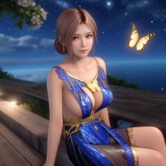 <lora:847-DA-XL-死或生-Elise-BirthdaySuit-20220903:0.8>, (,1girl, ,best quality, ),,  ,ultra realistic 8k cg, ,masterpiece, (( , )),,  fiction,mole, , ,      ,, 1girl,butterfly sitting,  night, star_\(sky\)(cleavage),,