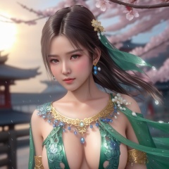 <lora:847-DA-XL-死或生-Elise-BirthdaySuit-20220903:0.8>, (,1girl, ,best quality, ),,  ,,ultra detailed 8k cg, ultra detailed background ,ultra realistic 8k cg,          cinematic lighting, cinematic bloom, (( , )),,  , unreal, science fiction,  luxury, jewelry, diamond, pearl, gem, sapphire, ruby, emerald, intricate detail, delicate pattern, charming, alluring, seductive, erotic, enchanting, hair ornament, necklace, earrings, bracelet, armlet,halo,masterpiece, (( , )),, realistic,science fiction,mole,   ,cherry blossoms,,(((Best quality, masterpiece, ultra high res, (photorealistic:1.4), raw photo, 1girl, ,rain, , sunlight, sunset, qianqiu wanxia,     )))  (cleavage),,  (),
