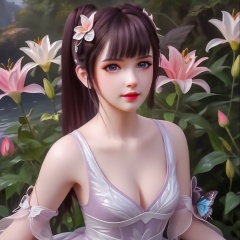 <lora:848-DA-XL-完美世界-火灵儿-幼年:0.8>, (,1girl, ,best quality, ),,  ,ultra detailed 8k cg,ultra realistic 8k cg,1girl, solo,(bare shoulders:0.85),(masterpiece, best quality),((oil painting style)),sexy young lady,(beautiful face and eyes),(upper body:1.5),(whole body:1.05),(single person:1.2),surrounded by flowers, (lily), roses, floret, vegetation, white, purple, purplish pink,Impressionism,colorful,(Breast size:1.3),(cleavage),, butterfly,(sit),