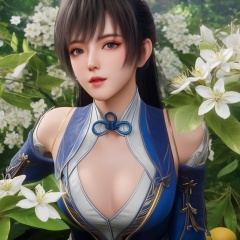 <lora:849-DA-XL-斗罗大陆-唐雅:0.8>, (,1girl, ,best quality, ),,  ,ultra realistic 8k cg, ,masterpiece, (( , )),,  fiction,mole, ,      , lemon blossoms,  (cleavage),,  (), ,,,