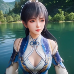 <lora:849-DA-XL-斗罗大陆-唐雅:0.8>, (,1girl, ,best quality, ),,  ,ultra detailed 8k cg,   ,masterpiece, (( , )) , lake,upper body,   (cleavage),,  (),