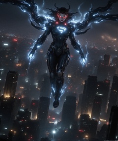 Superwoman, her entire body intricately modified with mechanical enhancements, hovers above the bustling skyline of New York City. Her metallic limbs and glowing red eyes contrast sharply against the night sky, casting eerie shadows upon the skyscrapers below. A fusion of advanced technology and classic superhero aesthetics, this figure exudes a sense of awe and unease. The composition of this picture is dynamic with Superman in the center, while the cityscape forms an intricate backdrop. The perspective structure is aerial, capturing the vastness of New York from above. Her mechanical enhancements include robotic wings that enable flight and glowing blue energy emanating from her chest, reminiscent of a high-tech Kryptonian power source. The scene is set during twilight, with soft ambient light reflecting off the city's buildings and creating a dramatic interplay between light and shadow. In this moment, Superman's primary action involves a subtle but powerful gesture – one arm extended towards a distant horizon, symbolizing his protection over humanity despite his altered form. This scene evokes feelings of both admiration and fear, inviting viewers to ponder the future direction of superhero legends in an increasingly technological world. The painting style is inspired by cyberpunk aesthetics with dark tones and vivid neon accents, paying homage to artists such as Syd Mead and H.R. Giger while also drawing from contemporary digital art trends seen on platforms like Pinterest and MidJourney. The overall effect aims to be visually stunning and thought-provoking, blending classic superhero imagery with futuristic technology in a way that is both beautiful and unsettling.,large natural breast,soft breasts,dlrb,qihuanmopan,hkgod,mohuan,huge Breasts,cleavage
