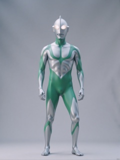 ultraman,silver bodysuit,silver gloves,legwear,gloves,boots,cover,mask,plugsuit,armor,bodysuit,green pattern on body,silver tight-fitting,silver footwear,helmet,leather suit,latex,tokusatsu,no humans,science fiction,silver head,hard mask,no smile,no eyes,no nose,solo,silver rubber bodysuit with green line