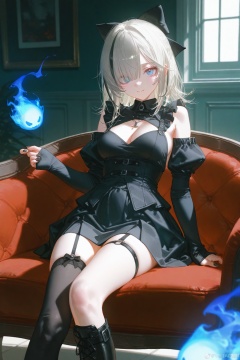1girl,thighhighs,breasts,solo,blue eyes,multicolored hair,ghost,cleavage,boots,black footwear,bow,black nails,smile,skirt,looking at viewer,virtual youtuber,black bow,grey hair,frills,streaked hair,hair bow,medium breasts,sleeves past wrists,asymmetrical legwear,medium hair,closed mouth,hair over one eye,black skirt,long sleeves,garter straps,black hair,knee boots,dress,bare shoulders,single thighhigh,indoors,hitodama,black thighhighs,long hair,masterpiece,best quality,very aesthetic,absurdres,{{artist:pottsness}},[[artist:onineko]][[artist:as109]],artist:ciloranko,artist:john kafka,artist:wanke,artist:betabeet,artist:quasarcake,(artist:alphonse \(white datura\):0.3),(artist:fkey:0.1),(artist:konya karasue:0.2),(artist:dino \(dinoartforame\):0.8),(wlop:0.7),